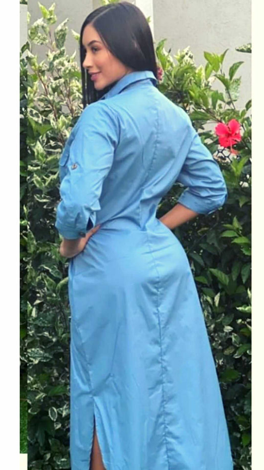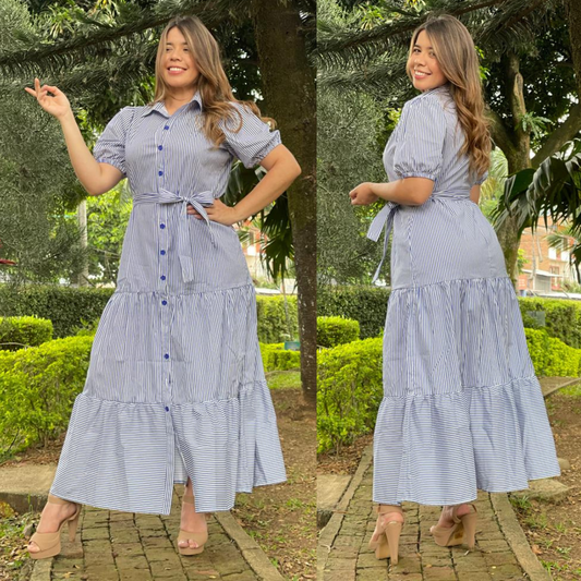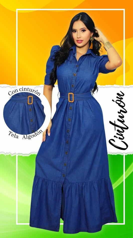 Vestido Largo en ALGODÓN SUAVE- Cinturón y Botonera - Ref 1058